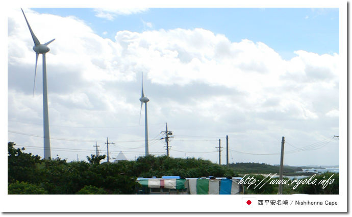 | Nishihenna Cape, which is the western cape of Miyakojima. Although it is less well known than the East Henna Cape, the highlight may be the Nishihenna Cape. The parking lot and observatory are well maintained, making it very easy to reach, and the view is great. Not only can you see the emerald green sea, but you can also see the huge wind power generation that is a symbol, and the Ikema Bridge that connects Miyakojima and Ikemajima. |