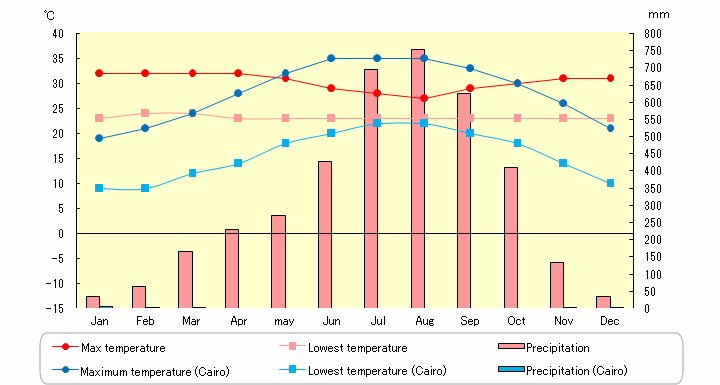 The weather in Douala is hot and humid throughout the year. There is a rainy season and a dry season. The rainy season has a particularly high amount of rainfall, and even in the dry season there are many cloudy days.
