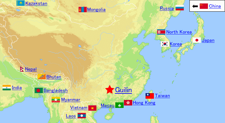 Kazakstan India Nepal Bangladesh Myanmar China Bhutan Vietnam Macau Laos Taiwan Hong Kong Russia Mongolia North Korea Korea Japan Guilin