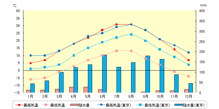 最低気温 -6 -5 -1 3 7 10 13 13 8 4 -1 -4