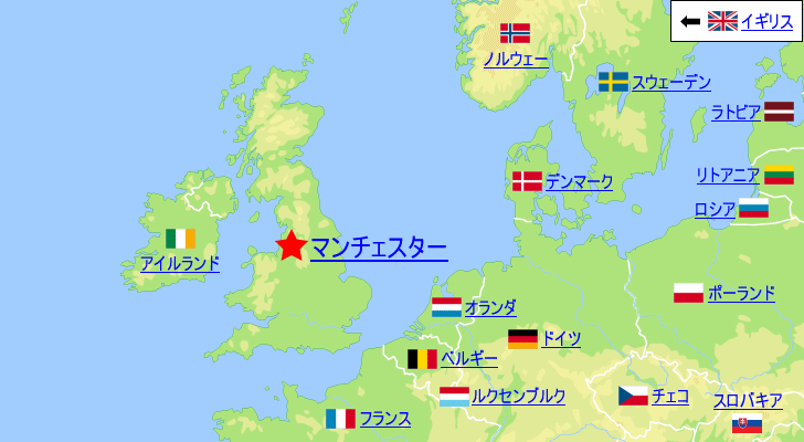 アイルランド ノルウェー スウェーデン ラトビア リトアニア ロシア ポーランド デンマーク オランダ ドイツ ベルギー フランス ルクセンブルク チェコ イギリス マンチェスター