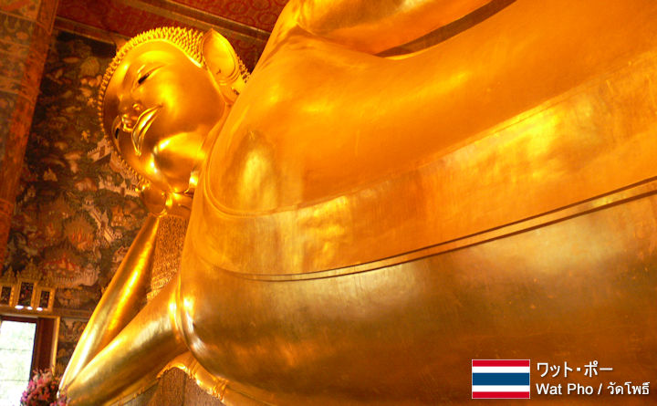 | 横になっている巨大な仏像で有名な寺院が、ワット・ポー。 ワット・ポーは、1793年にバンコク王朝のラマ1世がアユタヤ時代からあった寺院を改修して建てられ、その後ラマ3世がさらに改修を実施しで学問所とした。 巨大な仏像は長さ46mにもなり、足の裏にも108の絵が描かれているので、見逃さないように。 また礼拝堂の脇には賽銭箱が並んでおり、全ての賽銭箱に賽銭すると願いがかなうといわれている。小銭がないときには、賽銭箱の始まりの場所に、両替もしているので利用しよう。 |