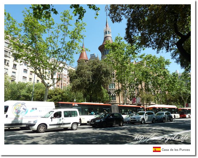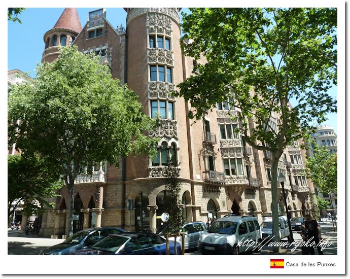 | とんがり帽子のレンガ造りの建物が特徴的な、カサ・ラス・プンシャス。 カサ・ラス・プンシャスはジュセップ・プッチ・イ・カダファルクによって、テラーダス家所有の集合住宅として建てられた。遠くから見てもわかる特徴的な6本の尖塔は、「棘(トゲ)の家」という愛称で地元に人に慕われている。 |