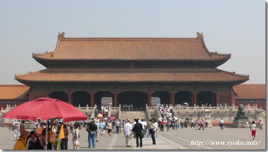 | 午門をくぐりると大きな広場があり、その正面に堂々たる風格で建っている門が、太和門。太和門は明の時代に建てられ、当初は奉天門と呼ばれたが、その後皇極門に変わり現在の太和門に至る。太和門では毎朝、明の文武官が集まり皇帝を待ち朝拝を受けた。 | ||