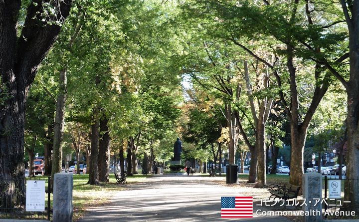 | ボストンの主要なストリートのひとつである、コモンウェルス・アベニュー。 コモンウェルス・アベニューは道の中央に細長い公園のような散策道があり、ボストンの街並みを楽しみながら散策ができるので、落ち着いて雰囲気を楽しみたい人には最適。地元の人も多く利用しており、途中にはモニュメントなどもあり長い距離であるが充分楽しめる。 |
