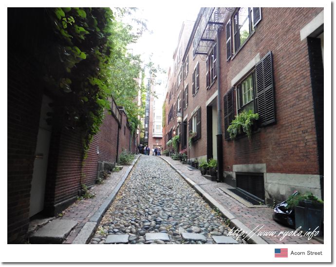エーコン通りは昔ながらのボストンの雰囲気で、特に19世紀の石畳が残っている通りとして有名。細いと路地が昔のイメージをより増幅させている。