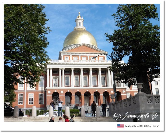 | 金色に輝くドームが印象的な、マサチューセッツ州会議事堂。 マサチューセッツ州会議事堂は1798年に建てられた州会議事堂で、その後何度か改築を重ね現在に至っているが、シンボルとなっている金色に輝くドームには金箔が貼られている。第二次世界大戦時には爆撃を避けるために、一時的に黒色になったが、その後、再度金箔が貼り直されている。 フリーダムトレイルの2番目のスポットとなっていることと、ボストン・コモンからも見える場所にあるため、迷わずに行くことができる。 |