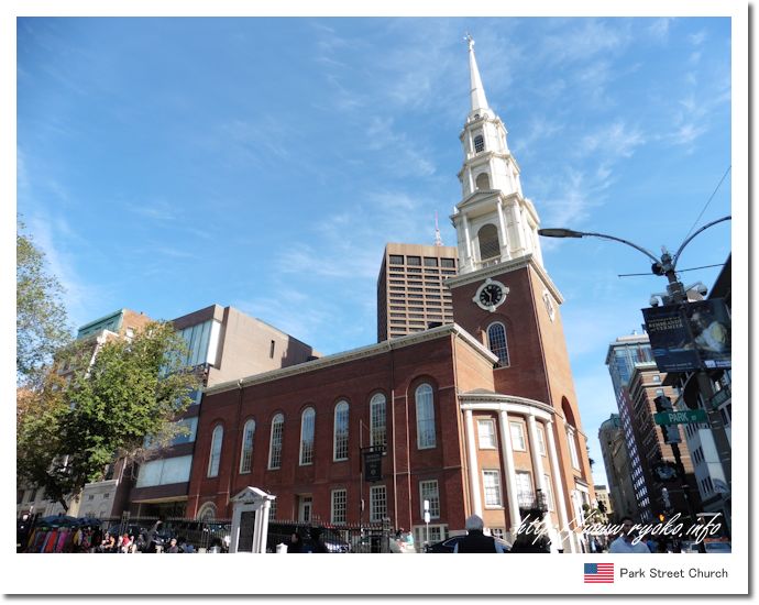| 美しい白い尖塔がまぶしい、パークストリート教会。 パークストリート教会は1809年に建てられたボストンの中心部にある教会で、米英戦争時には弾薬庫として使用されていたこともあったが、最も有名なのが1829年7月4日にアメリカで初めて奴隷制度反対演説が行われた場所として使用されたこと。その後も奴隷制度反対の聖地として何度も演説会が行われていた。 フリーダムトレイルの3番目のスポットでもあるため観光客も多く、特に美しい外観をバックに記念撮影をする観光客が多い。 |