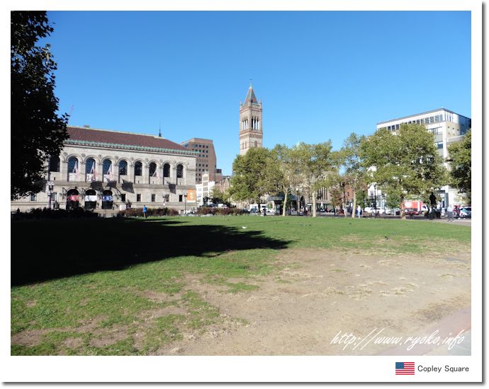 | トリニティ教会とボストン公共図書館の間にある広い空間が、コープリー・スクエア。 コープリー・スクエアでは、5月中旬から11月中旬までの毎週火曜日と金曜日にファーマーズマーケットが開催されるので、日時があえば訪れてみたい。またそれ以外の日でも、ボストン市街地にある憩いの場となっている。 |