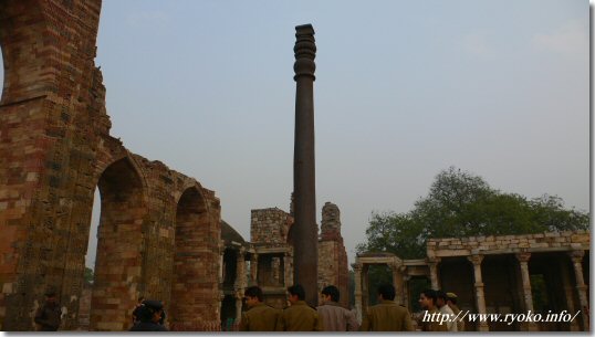 | クトゥブ・ミーナール内にある高さ7mにもなる鉄柱。 一見すると単なる鉄柱だが、4世紀のグプタ朝時代に造られたといわれている。 ただこの鉄柱のすごいところが、いまだに錆びていないところ。鉄の純度が100%に近く錆びないとのこと。 |