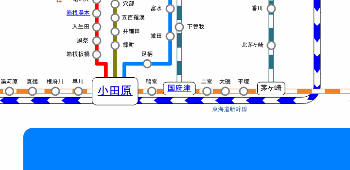 国府津海岸 / 横浜銀行国府津支店 / 山近記念総合病院 / 国府津交番 / 市立国府津小学校 / 市立前羽小学校 / 国府津1〜4丁目 / バス・タクシーのりば