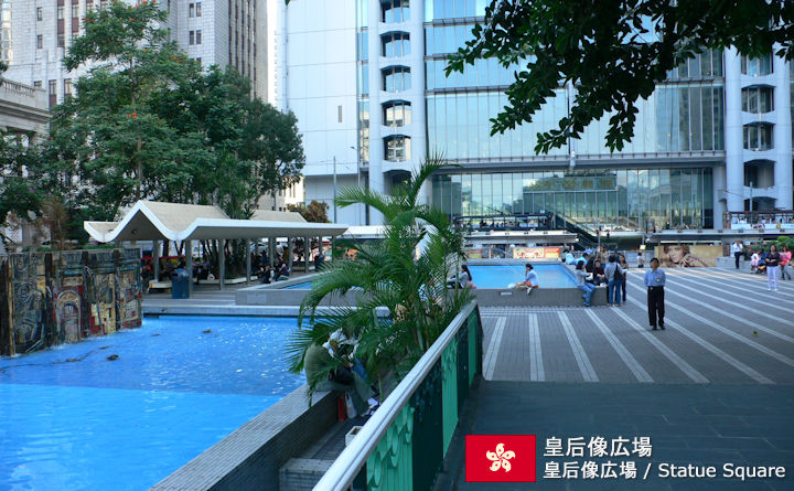 | 1965年にマーガレット王女の来訪を記念して造られた、皇后像広場。 皇后像広場では香港金融界の中心的人物だったトーマス・ジャクソンの銅像が立っていて、シンボル的な存在となっています。また休日には香港へ出稼ぎに来ているフィリピン人のお手伝いさんが集まり、この広場は平日と違い人々で溢れています。 |