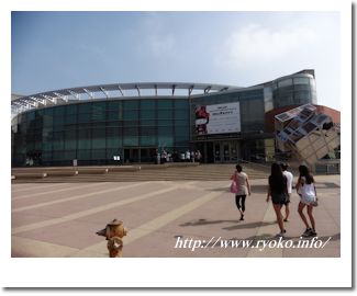 近代的な外観と、正面広場にあるオブジェが印象的な施設。