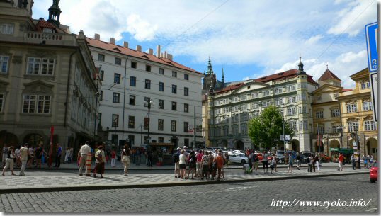 | 小地区の建物が建ち並ぶ狭い路地を抜けると当然大きな広場が現れる。その広場が、マラー・ストラナ広場。 マラー・ストラナ広場は市電の拠点となる停留所にもなっており、いつも多くの人であふれている。 |