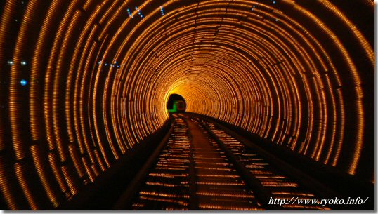 | 黄浦江を挟み、外灘地区と浦東地区を結ぶ地下道が、外灘観光トンネル。外灘観光トンネルは地下道といっても歩いて渡るのではなく、15人乗りのカートにて渡ることになる。その間約5分と短い時間だが、トンネル内には光のイルミネーションが施されていて、観光名所の一つとなっている。 | |||||||||||||||||