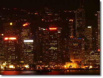 灣仔 香港の様々な色の発信源でもあるこの2つの看板。”HITACHI”と”SIEMENS”は、赤色と青色の光が並んでいるため海面に映る光景は、すばらしい。 |