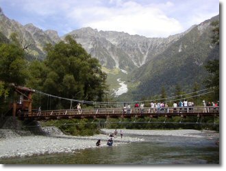 河童橋 上高地の一番の観光ポイントが河童橋。 河童橋と背景の穂高連峰を見る風景は絶品。 |