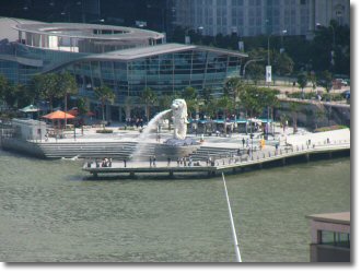 | マーライオン公園全景 マーライオン公園の全景はこんな感じ。マーライオンを正面から見れるように、桟橋が張り出しているのはうれしい限り。またマーライオン公園内には売店もある。 |