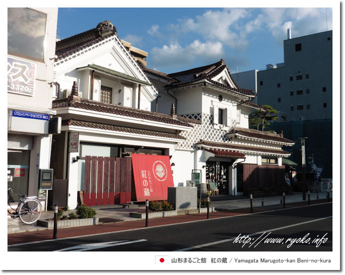 | 近代的な建物の中で江戸時代にタイムスリップしたような蔵屋敷が、山形まるごと館 紅の蔵。 山形まるごと館 紅の蔵は、実際に江戸時代に紅花商人として栄えた長谷川家の蔵屋敷を利用した施設で、山形の食材や地酒、伝統工芸品、物産品などを扱っている。まず西側の風情のある入口を入るといくつかの建屋があり、レストランでは山形の新鮮な食材を使用した欧風料理や創作スイーツ、イタリアンを飲食することができる。郷土料理コーナーでは山形蕎麦と郷土料理のほか、地酒も楽しむことができる。お土産店も敷地内にあり、山形の歴史や伝統を感じることができる特産品などを販売しているほか、地元生産者の採れたての農産物も販売している。また観光客向けには情報館があり、山形の観光情報を提供している。山形駅からも徒歩10分と近く、観光客にとって便利な複合施設となっている。 |
