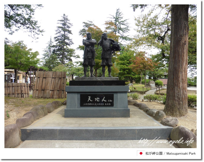 | 米沢観光の中心的な存在である、松が岬公園。 松が岬公園は、もともと米沢城があり、その城跡が公園として整備され松が岬公園となりました。公園内には歴代の藩主で最も米沢と縁が深い、上杉家にまつわる物が多数あります。その中でまず見たいのが上杉謙信の像です。上杉謙信は越後の印象が強い人が大半で、実際に米沢との関りもあまりありませんでした。しかし上杉謙信死後の関ヶ原の戦いで西軍についた上杉家は、敗北し領地が越後から会津そして米沢に変更させられました。その後、米沢で約300年にわたり上杉家の統治がなされたという背景があり、上杉家=米沢となり、その上杉家のルーツで最も有名な上杉謙信の像が建てられています。また公園内には上杉神社や上杉博物館などもあり、歴史の勉強や上杉家にまつわるお土産なども購入できます。また春には約200本もの桜が咲き乱れ、お堀と桜の絶景を楽しむことができます。 |